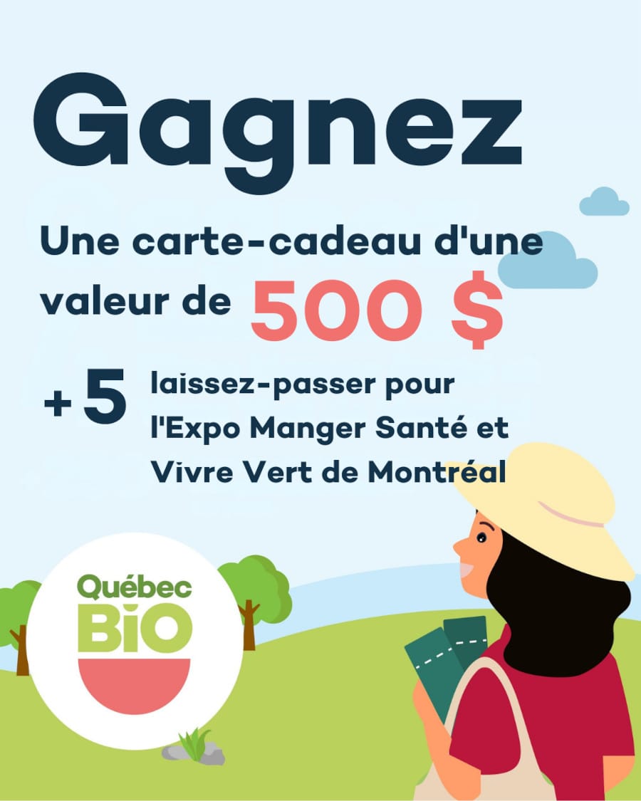 Dans le cadre d’Expo Manger Santé et Vivre Vert, QuébecBio vous offre la chance de gagner une (1) carte-cadeau d’une valeur de 500 $ pour remplir votre panier de savoureux produits bios d’ici, chez un marchand de notre choix situé dans votre région + cinq (5) laissez-passer pour visiter l’Expo Manger Santé et Vivre Vert de Montréal.