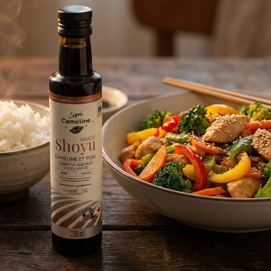 Sauce de type soya sans soya ni blé, fermentée 12 mois au Québec avec de la caméline et des pois d’ici. C’est une délicieuse alternative à la sauce soya, mais sans soya et sans gluten. La rondeur du goût de la caméline se marie à merveille avec légumes racines, fruits de mer, tofu et salades. Avec sa puissance aromatique, quelques gouttes suffiront pour sentir et goûter une délicate saveur iodée et d’umami, teinté de caméline torréfiée en finale. En collaboration avec Symbiose Alimenterre.