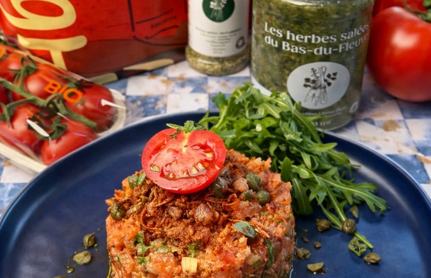 L’esprit bistro en version végé: un tartare de tomates frais servi avec un délicieux tofu rôti style bacon.