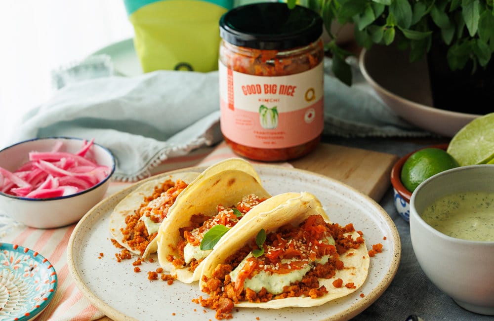 - Au moment de déguster, garnir les tortillas de la préparation de tofu, de la sauce, d’oignons, de kimchi, de graines de sésame et de quelques feuilles de basilic thaï.