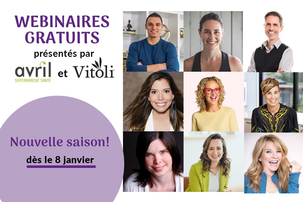 Les webinaires gratuits présentés par Vitoli et Avril c’est une série de conférences en ligne animées par des professionnels de la santé passionnés, qui abordent des sujets actuels, pratiques et motivants pour vous aider à prendre soin de vous au quotidien. Ils sont principalement animés par Éric Simard, docteur en biologie et chercheur, qui amène un côté scientifique et dynamique au rendez-nous hebdomadaire.